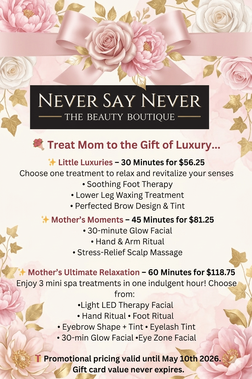 Never say Never… darling! Our gift cards can be enjoyed in Services, Products or both. Great for Holidays, Birthdays, Anniversaries, or Just Because! And of course, our Gift Cards are Beautifully gift wrapped and ready to Give!!